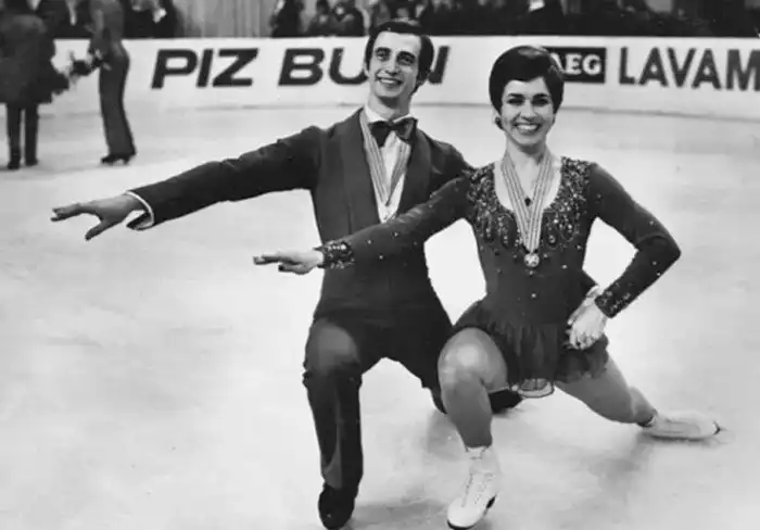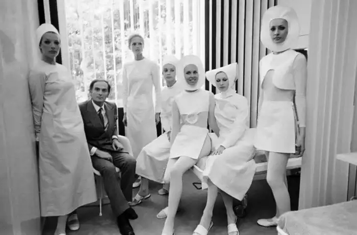 15. Модельер Пьер Карден позирует с моделями в своем футуристическом видении униформы для медсестер в Париже, Франция, 1970-е год