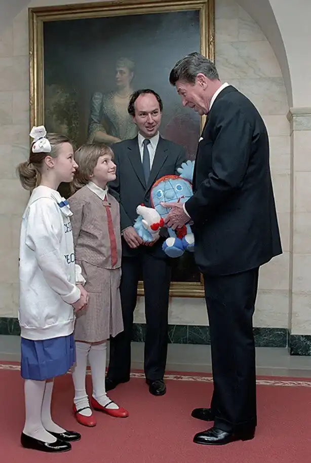 19. Президент Рейган получает подарок во время встречи с американской школьницей Стар Роу и советской школьницей Екатериной Лычевой, путешествующей по Соединенным Штатам при поддержке калифорнийского фонда «Дети для миротворцев» 27.03.1986