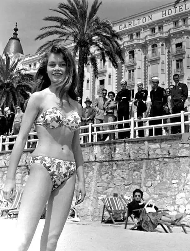 35. Юная Бриджит на пляже около отеля Carlton в период le **Festival de Cannes**