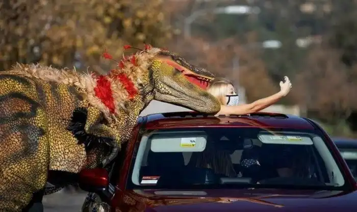 Селфи с динозавром: на самом деле это квест, посвященный юрскому периоду, и человек в костюме