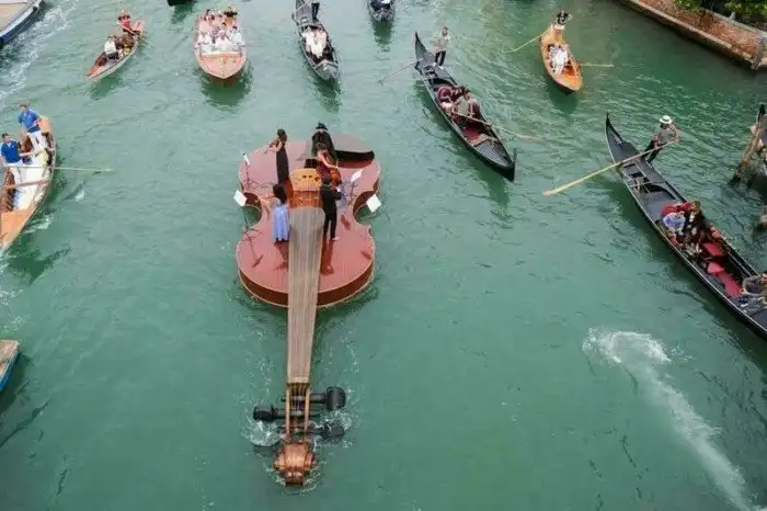 Струнный квартет на лодке в форме скрипки на венецианском канале