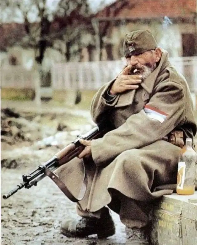 Пожилой сербский солдат с СКС во время осады хорватского Вуковара. 1991 год.
