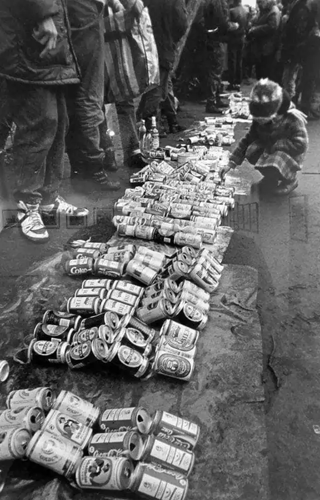 Продажа пустых металлических банок из-под импортных напитков на одном из «блошиных» рынков, Россия, 1990-е.