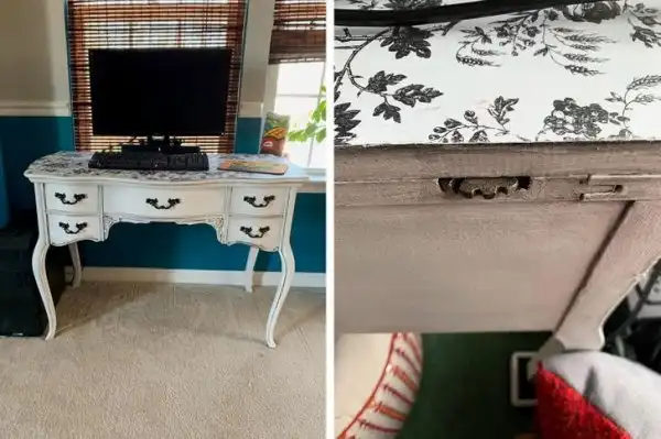 Это для крепления зеркала. Оно находилось в деревянной раме с двумя резьбовыми стойками, которые вставляются в отверстия в верхней части стола.