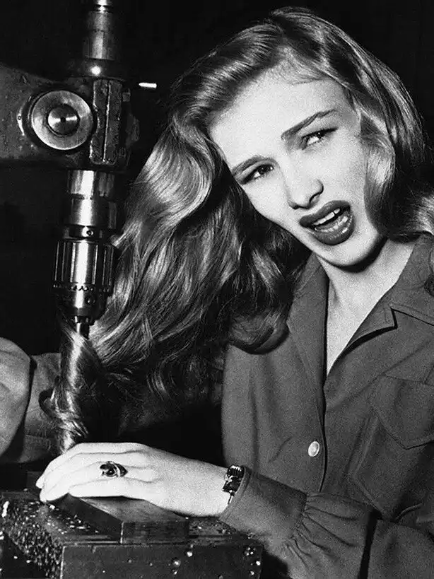 15. Американская киноактриса Вероника Лейк иллюстрирует, что может случиться с женщинами-военщинами, которые носят длинные волосы во время работы на станках на фабрике где-то в Америке 9 ноября 1943 года.
