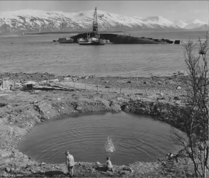 21. Эхо войны: норвежские дети играют у воронки от бомбы на фоне затонувшего линкора "Тирпиц".