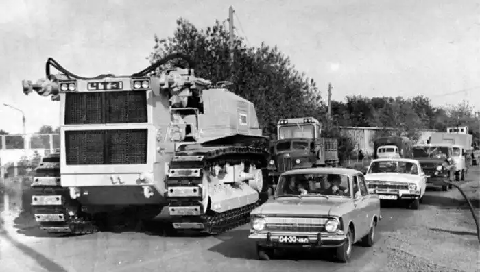 30. Сверхтяжёлый промышленный трактор Т-800 перегоняют своим ходом с завода, для дальнейшей сборки. 1983 г.