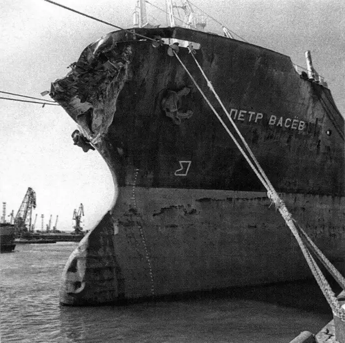 31. Сухогруз «Пётр Васёв» после столкновения 31.08 86 года с пассажирским пароходом «Адмирал Нахимов», недалеко от Новороссийска, в ходе которого погибло 423 человека