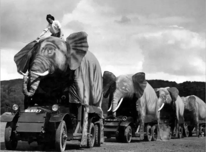 Английские бронеавтомобили Lanchester Мк. II, замаскированные под слонов. В годы Второй мировой такая маскировка применялась британцами в Индии.