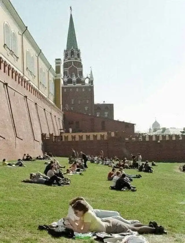 Москвичи отдыхают на газоне у кремлёвской стены. Москва, Россия, 1999 год.
