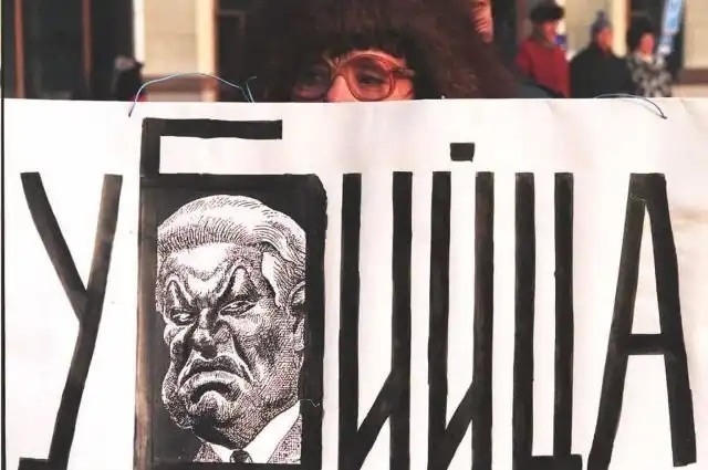 Женщина держит плакат с карикатурой на президента России Бориса Ельцина, во время демонстрации коммунистов против военных действий в Чечне. 8 января 1995 года.