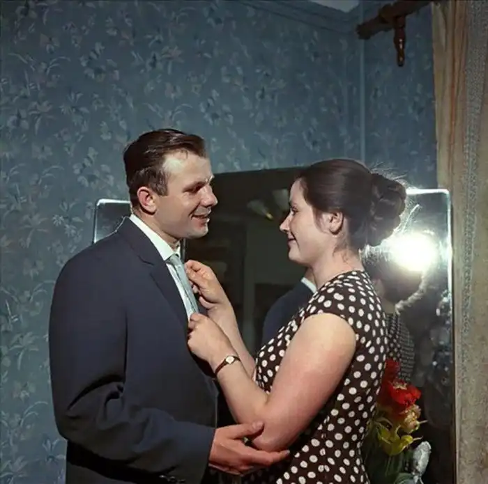 11. Летчик-космонавт СССР Юрий Алексеевич Гагарин дома с женой Валентиной. Рюмкин Я.И. Огонёк 1962.
