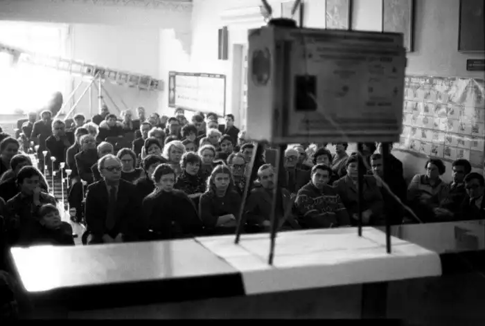 27. Похороны Генерального секретаря ЦК КПСС Юрия Андропова транслируются в городском клубе Новокузнецка в 1984 году