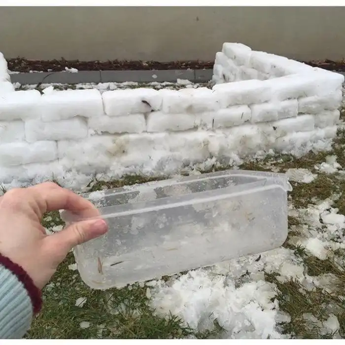 Используйте пластиковый контейнер, чтобы слепить «кирпичи» для снежной крепости