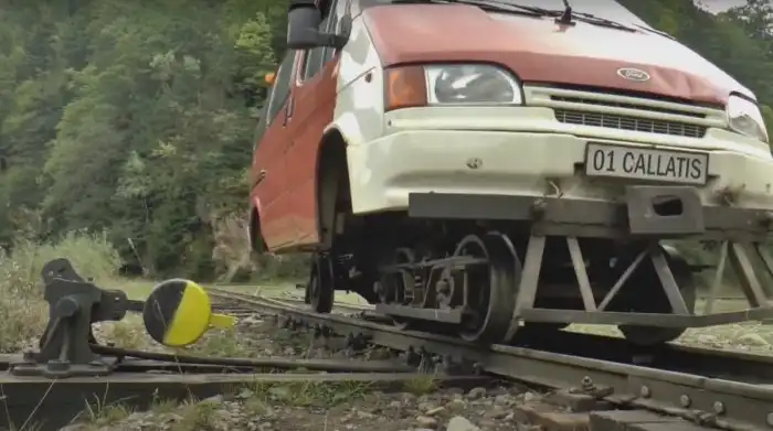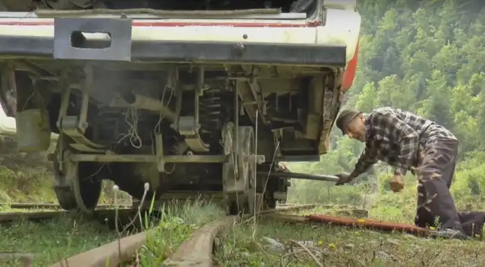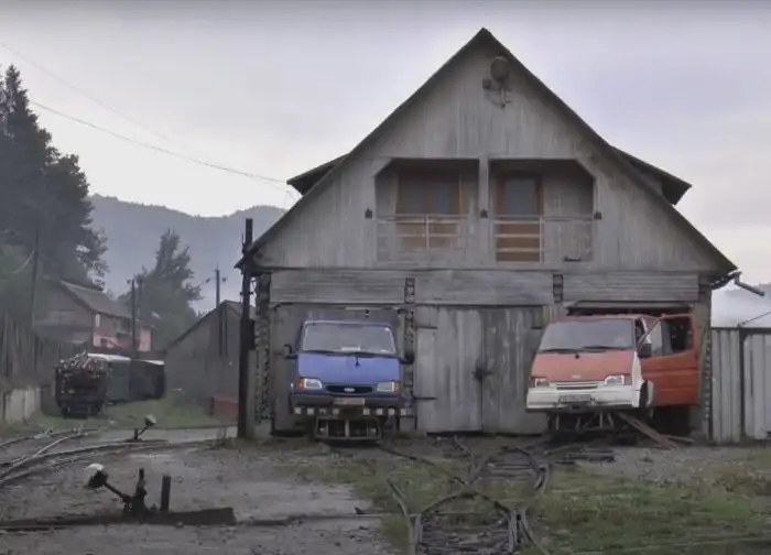 Но вместо того, чтобы разобрать эти рельсы и сдать их на металлолом, они решили построить здесь ж/д депо в виде сарая. И как можно видеть, их подвижной состав состоит из двух переделанных под езду по рельсам фургонов Форд Транзит.