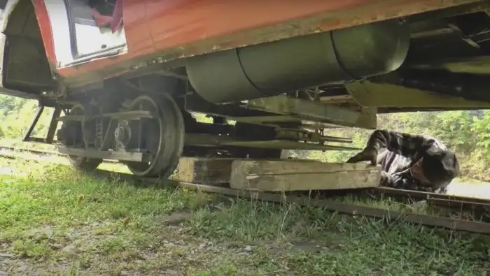 В результате весь фургон приподнимается, реборды колёс выходят из зацепления с головками рельс, и весьма немолодой мужчина довольно-таки легко может один развернуть весь фургон на месте.