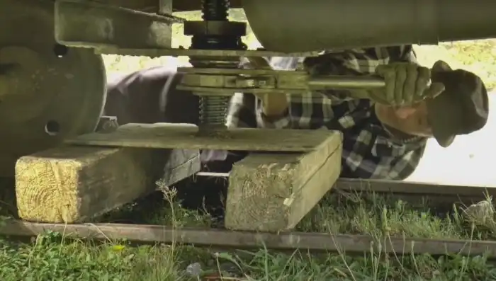 После того как бруски легли на рельсы, а плита устойчиво встала на них, можно начинать вращать винтовой домкрат рычагом.