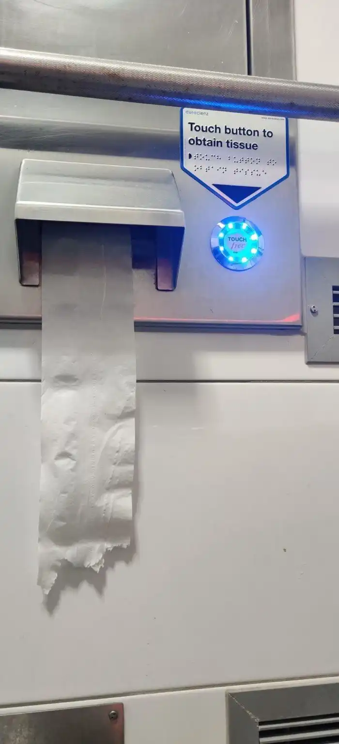 В этом общественном туалете вас заставляют касаться одной и той же грязной кнопки, которую нажимали все остальные, вместо того, чтобы просто отрывать чистую бумагу, к которой никто не прикасался.