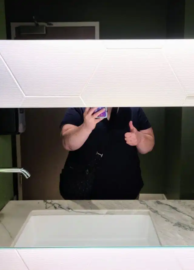 14. Ванная комната в ресторане: одна зеркальная панель сверху, другая снизу… я не могу увидеть себя между ними