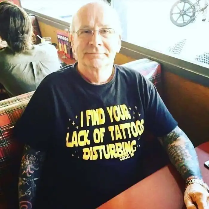 "В молодости он служил на флоте, и однажды ночью они с сослуживцами выпили и решили сделать татуировки. Он позвонил домой, чтобы спросить мою бабушку, не против ли она, и она ответила, что против. И это было к лучшему, потому что остальные наутро проснулись с воспалившимися и кривыми надписями на теле. Но желание-то у папы никуда не делось! И вот сейчас, спустя 58 лет, он его осуществил".