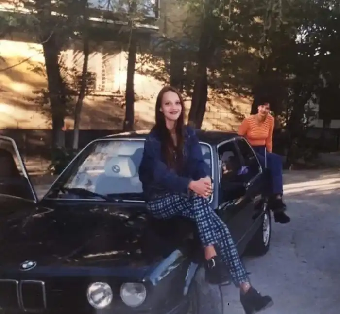 20. Мама с дочкой позируют возле купленного автомобиля «BMW», 1990-е годы