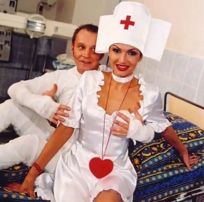 40. Гeopгий Дeлиев и Эвелина Блёданс на съёмках пepeдачи Маски-шоу, 90-e
