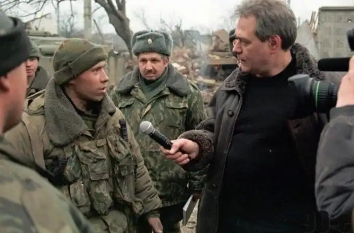 Журналист Сергей Доренко беседует с российскими солдатами, освободившими Грозный. Февраль 2000 года