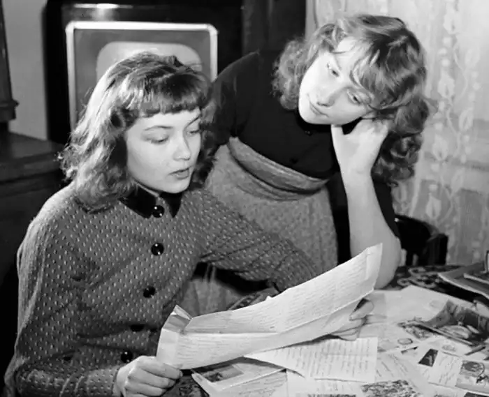 17. Киноактриса Жанна Болотова (слева) и ее подруга Т. Кандыбина разбирают письма, присланные Жанне кинозрителями. 1958 год