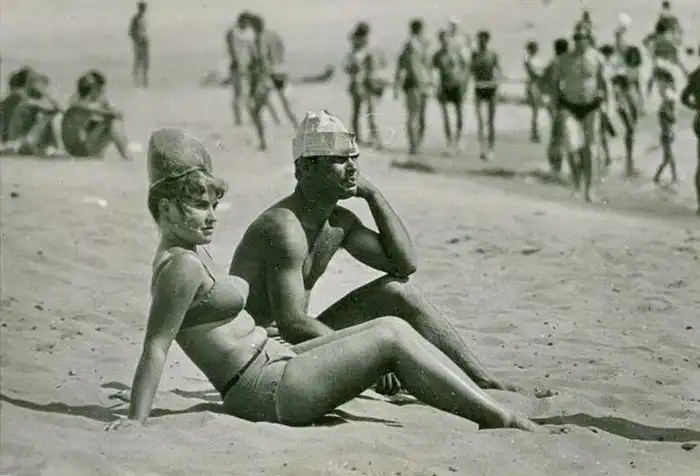 Пилотка из газеты - в то время популярный мужской пляжный головной убор.