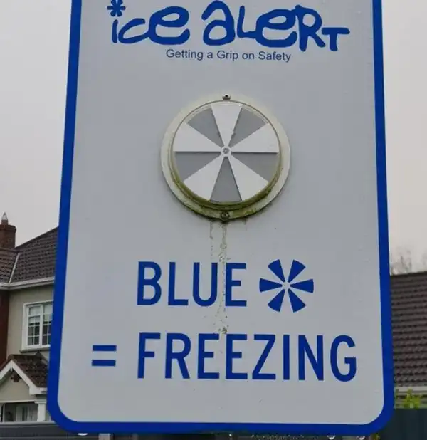 Этот знак становится синим, если на улице достаточно холодно для образования гололеда