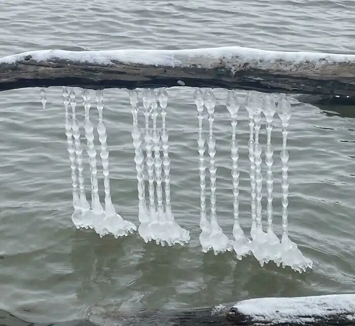 Замерзшая вода сама себя выдавливает из дырки в перилах
