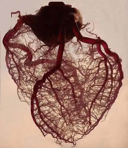 Человеческое сердце, лишенное всего жира и мышц, с открытыми только коронарными артериями и сердечными венами
