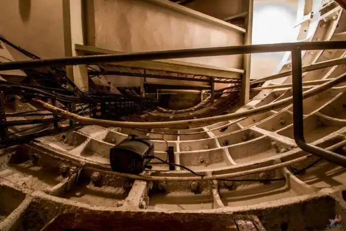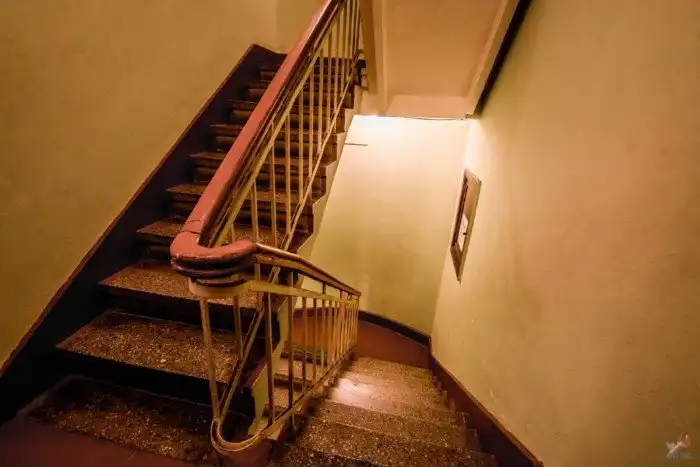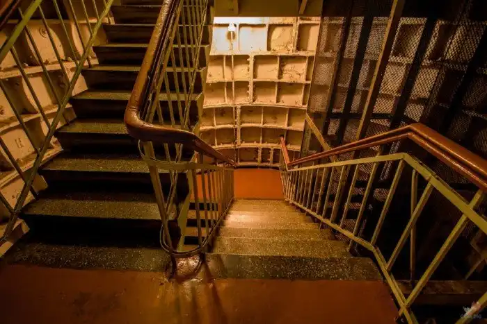 Спуск вниз.В стволе стоит запах хлорки. До прихода экскурсионной группы здесь как помыли ступеньки и полы. Уход за объектом и уборка внутри него, несмотря на маленькую группу обслуживающего персонала - здесь на высшем уровне.