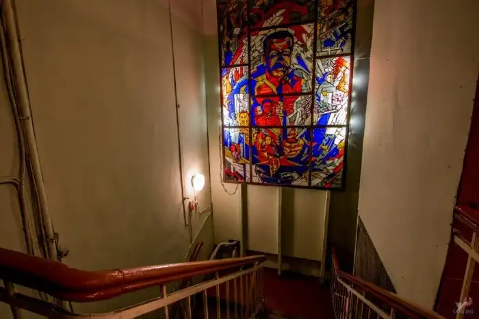 Вход в бункер.Перед стволом висит красивый подсвечиваемый витраж с образом вождя. Ствол отделан металлическими тюбингами, которые до сих пор являются важной составляющей при строительстве современных тоннелей и станций метрополитена.