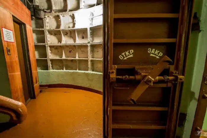Вид снизу-вверх.Внизу ствола находится вход в помещения жизнеобеспечения и жилые комнаты. Меня очень смутила современная гермодверь. Видимо, когда объект еще стоял на балансе, все двери и систему вентиляции заменили.