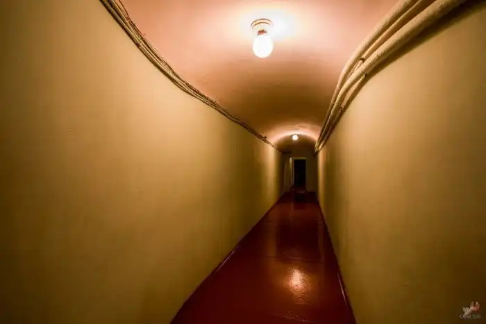 Коридор с ковровой дорожкой.Просторный и светлый зал рассчитанный на два десятка человек. Выходит, бункер строили не только для одного Сталина.