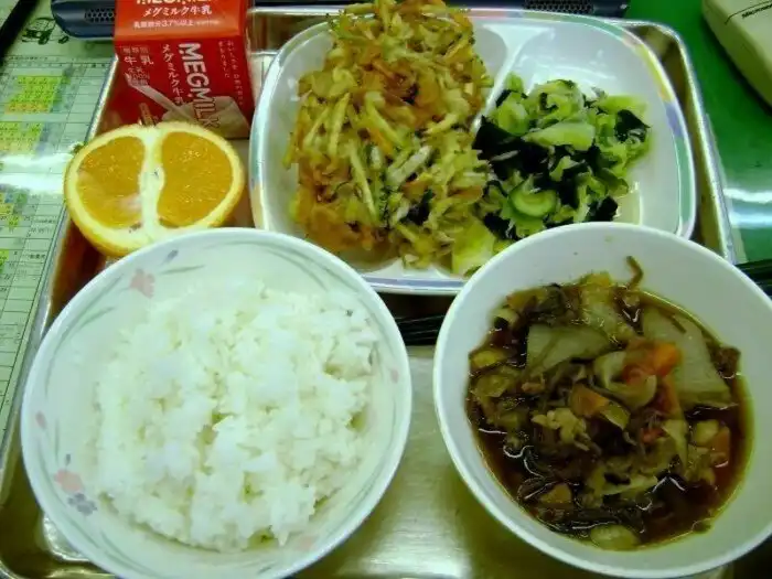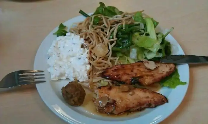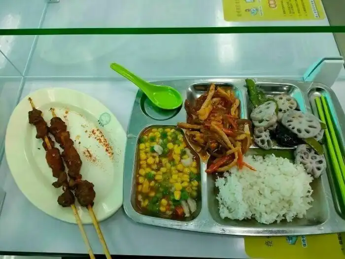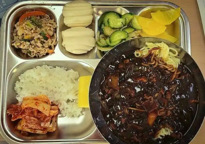 Обед в южнокорейской школе: лапша, яйца, свинина, а также несколько панчханов — небольших закусок и салатов