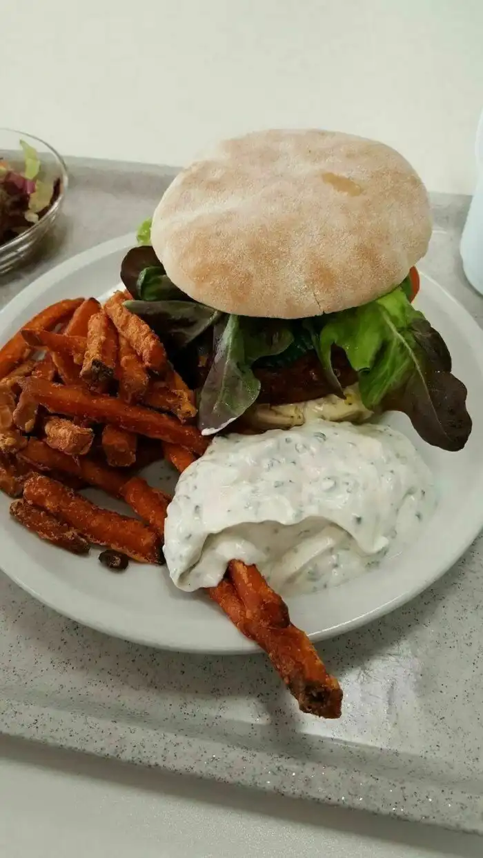 Вегетарианский гамбургер с бататом-фри в германской столовой