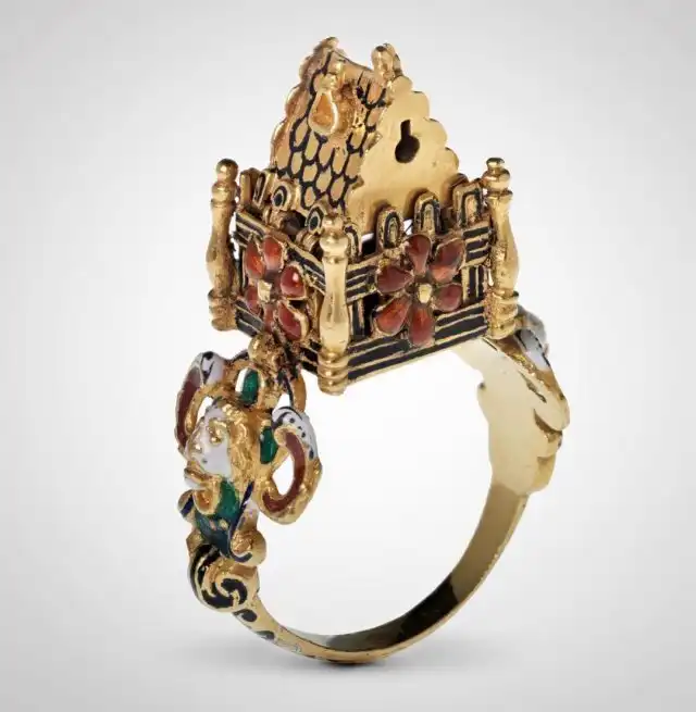 Обручальное кольцо. Домик с откидной крышей, возможно, символизирует супружескую жизнь. США, XIX век