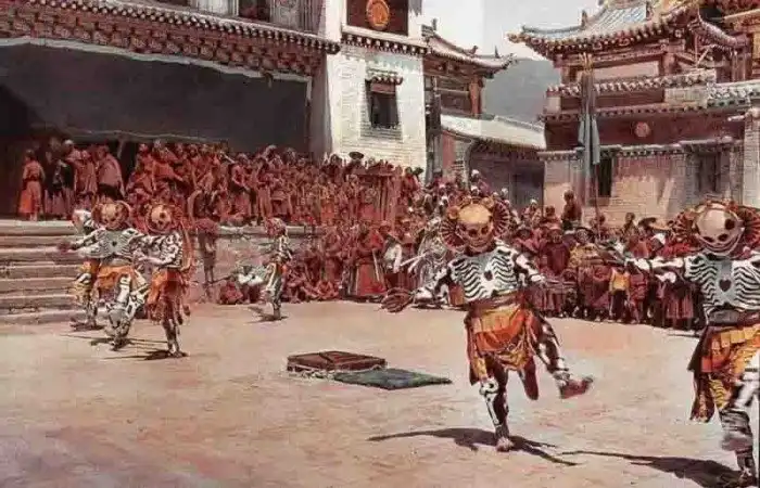 33. Тибетские танцоры-скелеты (буддийская традиция), автохром Джозефа Рока, 1925 год