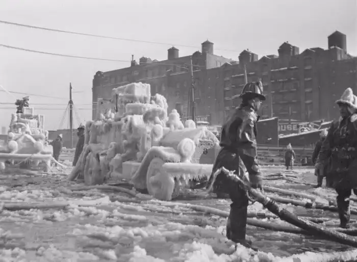 35. Обледеневшие пожарные машины во время тушения пожара. Бостон, Массачусетс, 1920 год