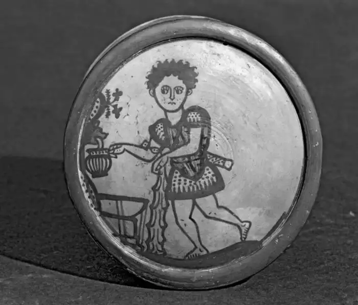 10. На крышке этой древнегреческой косметички изображен Геракл, набирающий воду из фонтана. 450 - 400 г. до н.э.