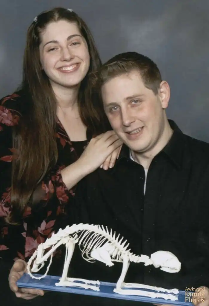 Когда мы только поженились, у нас еще не было ни детей, ни животных, - только кошачий скелет по кличке "Кость". Мы решили запечатлеть его на первом семейном фото"