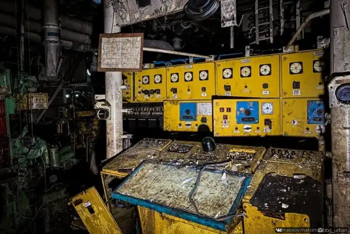 Оказываемся на борту корабля, длина которого больше 130 метров. Ощущаешь всю его мощь и размеры! Стоя у руля капитана судна и пытаясь осознать габариты, становится страшно представить, как же сложно управлять этой махиной в узких речках, ведь эти танкеры имели класс река-море.Мостик сохранился вполне не плохо, правда, вся навигация давно уже уничтожена мародерами, скорее всего, еще несколько лет назад. И все это останется безнаказанным, так как управляющей компании больше нет, а хозяин этого плавающего железа сидит в местах не столь отдаленных.Повсюду разбросаны документы, карты навигации и разобранное оборудование.