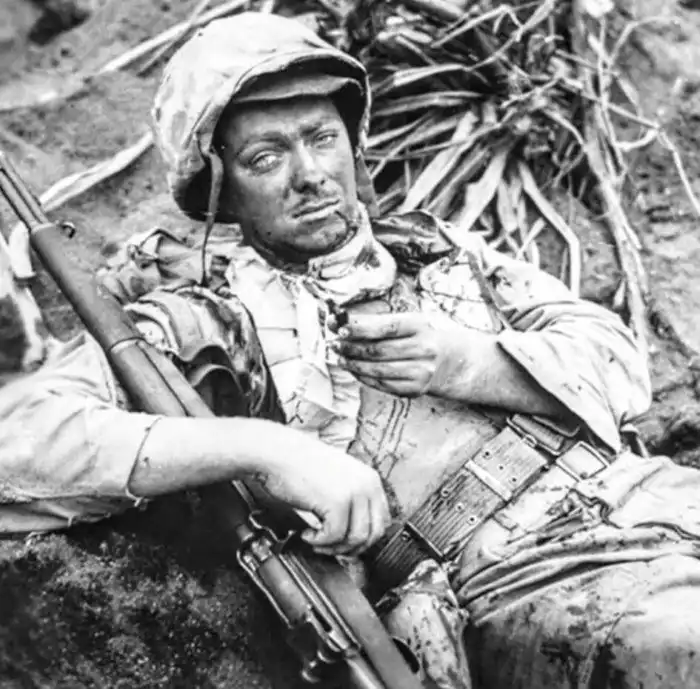 11. Капрал Рудольф Э. Энгстрем из Айовы в воронке от снаряда, с осколком в руке который его ранил. Иводзима, 20 февраля 1945 год