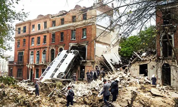 15. Последствия немецкой бомбардировки Лондона. Автобус был пуст, а в домах погибло 11 человек. 9 сентября 1940 года: Харрингтон-сквер, Лондон