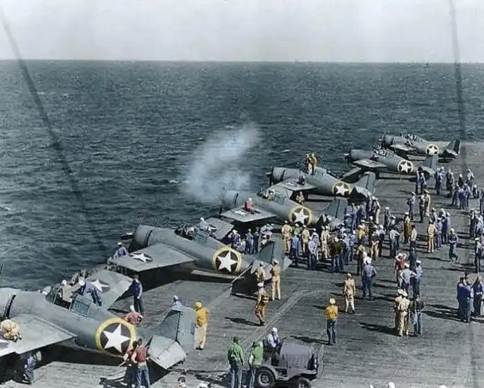 24. Проверка оружия истребителей Grumman F4F-4 Wildcat на борту USS Ranger (CV-4) по пути в Северную Африку, 1942 год