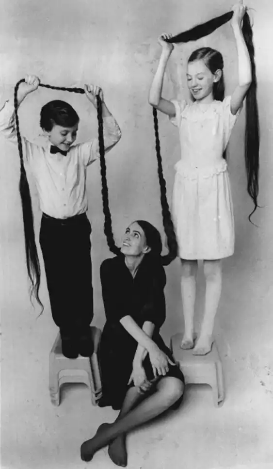 36. Будущая актриса Алисия Уитт , ее брат и мама Диана, которая была в Книге рекордов Гиннеса с 1988 по 1996 год за самые длинные волосы в мире 2 м. 59 см. 1989 год