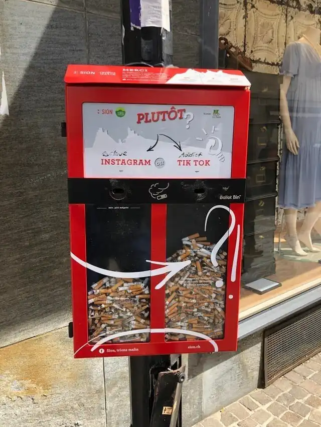 Такой мусорный контейнер придумали для того, чтобы люди выбрасывали туда бычки, а не оставляли на тротуаре