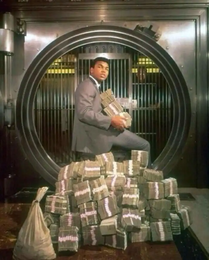 Мухаммед Али позирует со своими заработками во время фотосессии в 1964 году
